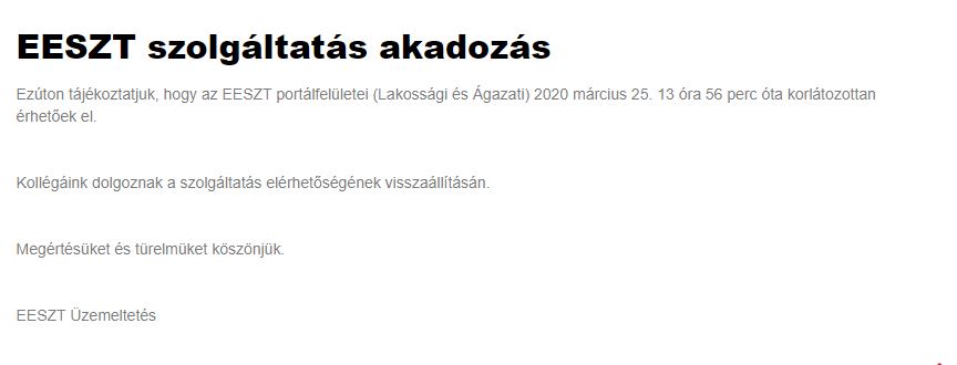 “Ezúton tájékoztatjuk, hogy az EESZT szolgáltatásai és a portálfelületek elérésében fennakadások tapasztalhatók. Kollégáink dolgoznak a szolgáltatás sebességének visszaállásán.