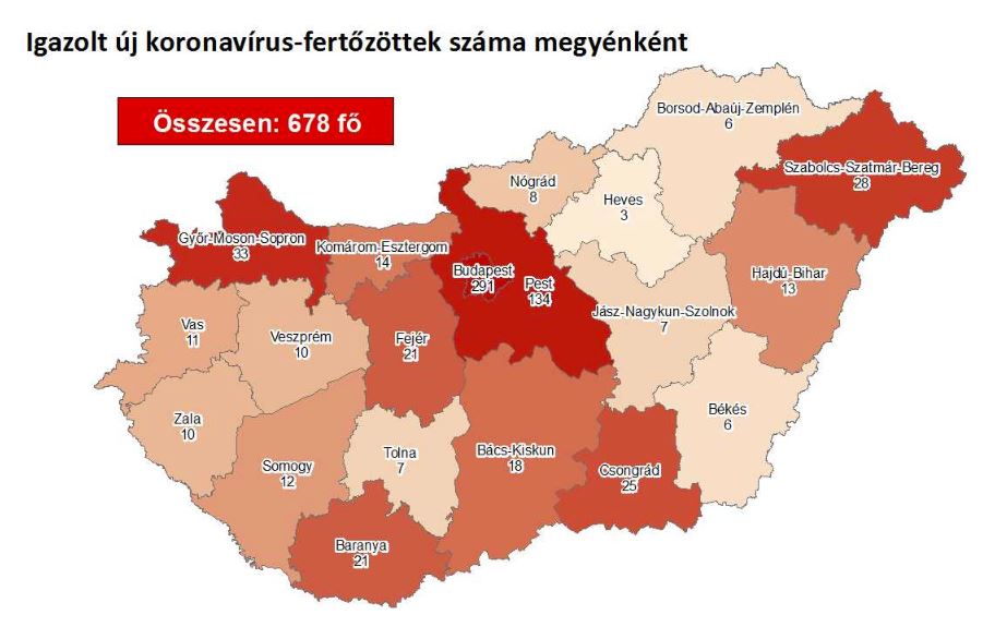 Újabb magyar állampolgároknál mutatták ki az új koronavírus-fertőzést (COVID-19), ezzel 678 főre nőtt a hazánkban beazonosított fertőzöttek száma. Elhunyt újabb 6 krónikus beteg, közülük öten 77 év felettiek. 58 főre emelkedett a gyógyultak száma is.