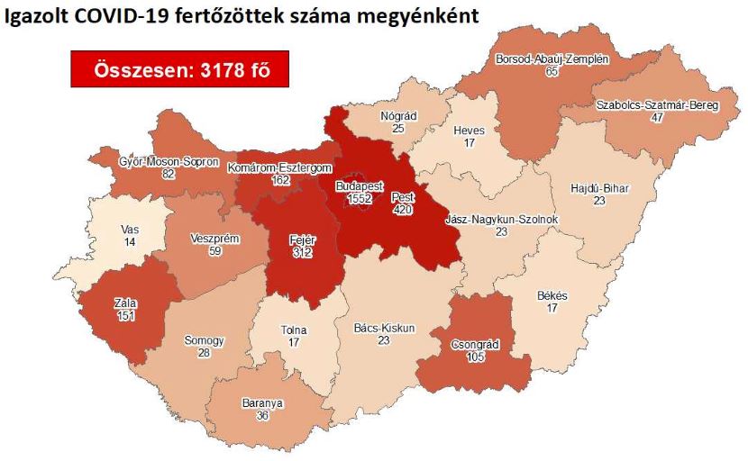 Újabb magyar állampolgároknál mutatták ki az új koronavírus-fertőzést (COVID-19), ezzel 3178 főre nőtt a hazánkban beazonosított fertőzöttek száma. Elhunyt újabb 9 idős krónikus beteg. Ezzel 392 főre emelkedett az elhunytak száma, 865-en pedig már gyógyultan távoztak a kórházból. Az aktív fertőzöttek száma 1921 fő. Az aktív fertőzöttek 62%-a, az elhunytak 79%-a, a gyógyultak 54%-a budapesti vagy Pest megyei. 1132 koronavírusos beteget ápolnak kórházban, közülük 74-en vannak lélegeztetőgépen. A Pesti úti idősotthonban 41 főre nőtt az elhunytak száma.