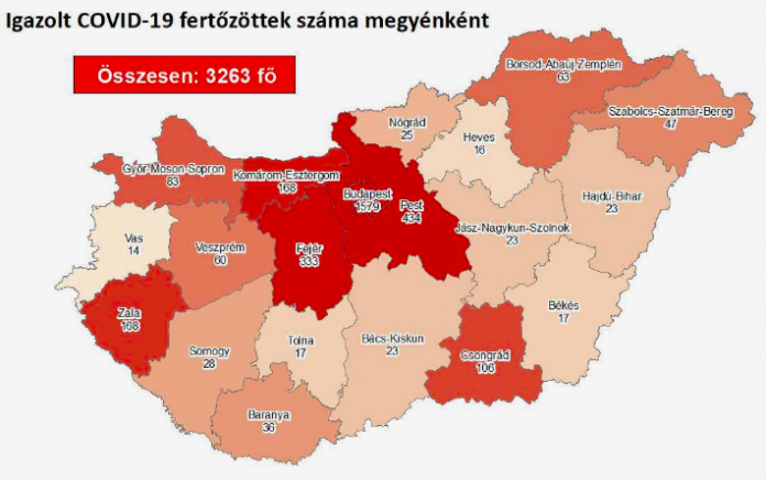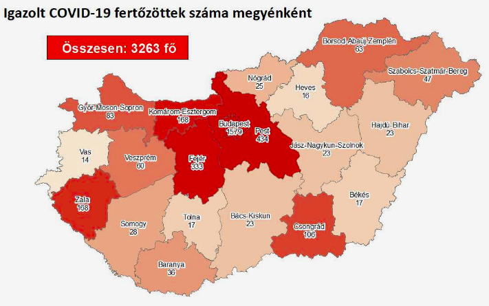 Újabb magyar állampolgároknál mutatták ki az új koronavírus-fertőzést (COVID-19), ezzel 3263 főre nőtt a hazánkban beazonosított fertőzöttek száma. Elhunyt újabb 8 idős krónikus beteg. Ezzel 413 főre emelkedett az elhunytak száma, 933-an pedig már gyógyultan távoztak a kórházból. Az aktív fertőzöttek száma 1917 fő. Az aktív fertőzöttek 62%-a, az elhunytak 79%-a, a gyógyultak 54%-a budapesti vagy Pest megyei. 812 koronavírusos beteget ápolnak kórházban és 50-en vannak lélegeztetőgépen. 98-ra nőtt az idősotthonokban koronavírus-fertőzéssel elhunyt gondozottak száma, ebből 42 a Pesti úti idősotthon lakója.