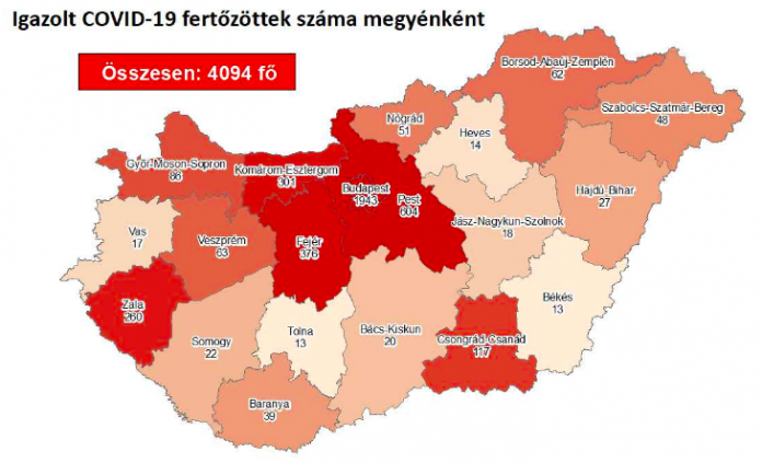 Mindössze 8 újabb magyar állampolgárnál mutatták ki az új koronavírus-fertőzést (COVID-19), ezzel 4094 főre nőtt a hazánkban beazonosított fertőzöttek száma. Az elmúlt 24 órában nincs újabb elhunyt, így változatlanul 570 az elhunytak száma, 2589-en pedig már meggyógyultak. Az aktív fertőzöttek száma 935 fő. Az aktív fertőzöttek 39%-a, az elhunytak 60%-a, a gyógyultak 48 %-a budapesti. 185 koronavírusos beteget ápolnak kórházban, közülük 15-en vannak lélegeztetőgépen.
