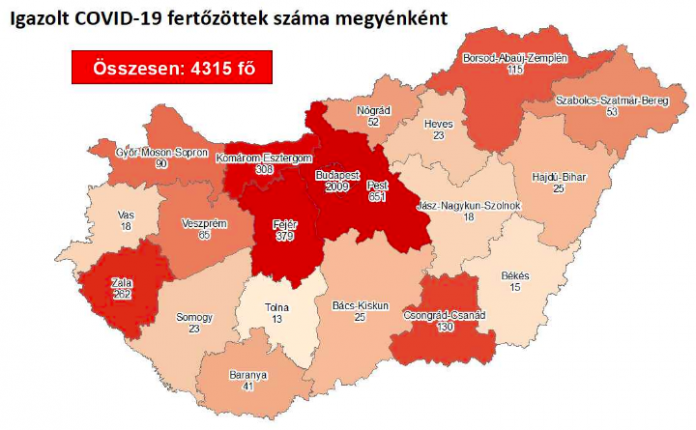 22 újabb magyar állampolgárnál mutatták ki az új koronavírus-fertőzést (COVID-19), ezzel 4315 főre nőtt a hazánkban beazonosított fertőzöttek száma. Elhunyt egy beteg, így az elhunytak száma 596 főre emelkedett, 3222-en pedig már meggyógyultak. Az aktív fertőzöttek száma 497 fő. Az aktív fertőzöttek 36%-a, az elhunytak 60%-a, a gyógyultak 46%-a budapesti. 83 koronavírusos beteget ápolnak kórházban, közülük 3-an vannak lélegeztetőgépen. Az új fertőzöttek esetében a járványügyi hatóság az eddigi rendnek megfelelően elvégzi a kikérdezésüket és a kontaktkutatást.