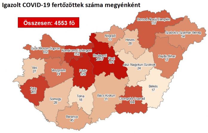 9 újabb magyar állampolgárnál mutatták ki az új koronavírus-fertőzést (COVID-19), ezzel 4553 főre nőtt a hazánkban beazonosított fertőzöttek száma. Elhunyt egy 77 éves krónikus beteg, így az elhunytak száma 598 főre emelkedett, 3415-en pedig már meggyógyultak. Az aktív fertőzöttek száma 540 fő. Az aktív fertőzöttek 36%-a, az elhunytak 60%-a, a gyógyultak 44%-a budapesti. 75 koronavírusos beteget ápolnak kórházban, közülük 7-en vannak lélegeztetőgépen.