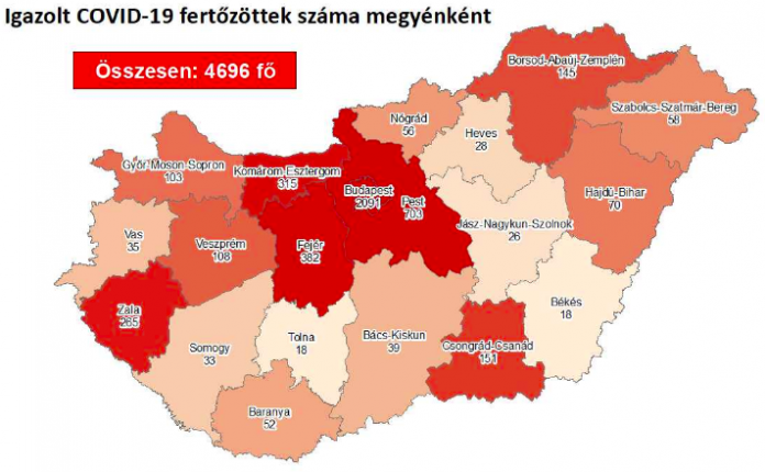 43 újabb magyar állampolgárnál mutatták ki az új koronavírus-fertőzést (COVID-19), ezzel 4696 főre nőtt a hazánkban beazonosított fertőzöttek száma. Az elhunytak száma változatlanul 602 fő, 3499-en pedig már meggyógyultak. Az aktív fertőzöttek száma 595 fő. Az aktív fertőzöttek 34%-a, az elhunytak 60%-a, a gyógyultak 44%-a budapesti. 73 koronavírusos beteget ápolnak kórházban, közülük 6-an vannak lélegeztetőgépen.