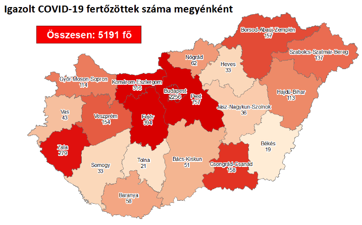 36 újabb magyar állampolgárnál mutatták ki az új koronavírus-fertőzést (COVID-19), ezzel 5191 főre nőtt a hazánkban beazonosított fertőzöttek száma. Az elhunytak száma változatlanul 613 fő, 3695-en pedig már meggyógyultak. Az aktív fertőzöttek száma 883 fő. Az aktív fertőzöttek 35%-a, az elhunytak 60%-a, a gyógyultak 43%-a budapesti. 59 koronavírusos beteget ápolnak kórházban, közülük 9-en vannak lélegeztetőgépen.