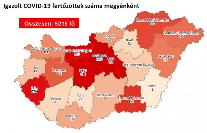 24 újabb magyar állampolgárnál mutatták ki az új koronavírus-fertőzést (COVID-19), ezzel 5215 főre nőtt a hazánkban beazonosított fertőzöttek száma. Elhunyt egy 94 éves krónikus beteg, így az elhunytak száma 614 főre emelkedett, 3716-an pedig már meggyógyultak. Az aktív fertőzöttek száma 885 fő. Az aktív fertőzöttek 36%-a, az elhunytak 60%-a, a gyógyultak 42%-a budapesti. 57 koronavírusos beteget ápolnak kórházban, közülük 7-en vannak lélegeztetőgépen.