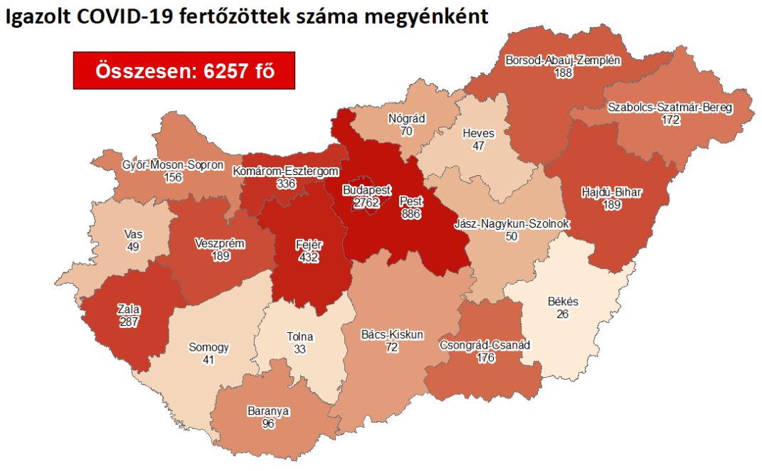 118 újabb magyar állampolgárnál mutatták ki az új koronavírus-fertőzést (COVID-19), ezzel 6257 főre nőtt a hazánkban beazonosított fertőzöttek száma. Elhunyt egy 74 éves idős beteg, az elhunytak száma így 616 főre emelkedett, 3821-en pedig már meggyógyultak. Az aktív fertőzöttek száma 1820 fő. Az aktív fertőzöttek 43%-a, az elhunytak 60%-a, a gyógyultak 42%-a budapesti. 96 koronavírusos beteget ápolnak kórházban, közülük 7-en vannak lélegeztetőgépen.