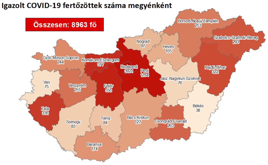 576 újabb magyar állampolgárnál mutatták ki az új koronavírus-fertőzést (COVID-19), ezzel 8963 főre nőtt a hazánkban beazonosított fertőzöttek száma. Elhunyt egy krónikus beteg, így az elhunytak száma 625 fő, 3961-an pedig már meggyógyultak. Az aktív fertőzöttek száma 4377 fő. Az aktív fertőzöttek 43%-a, az elhunytak 59%-a, a gyógyultak 42%-a budapesti. 164 koronavírusos beteget ápolnak kórházban, közülük 11-en vannak lélegeztetőgépen.
