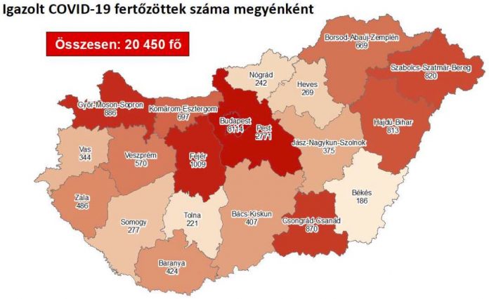 951 újabb magyar állampolgárnál mutatták ki az új koronavírus-fertőzést (COVID-19), ezzel 20 450 főre nőtt a hazánkban beazonosított fertőzöttek száma. Elhunyt 8 krónikus beteg, így az elhunytak száma 702 főre emelkedett, 4644-en pedig már meggyógyultak. Az aktív fertőzöttek száma 15 104 fő. Az aktív fertőzöttek 39%-a, az elhunytak 56%-a, a gyógyultak 40%-a budapesti. 558 koronavírusos beteget ápolnak kórházban, közülük 35-en vannak lélegeztetőgépen.