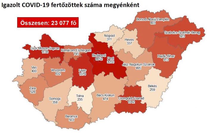 950 újabb magyar állampolgárnál mutatták ki az új koronavírus-fertőzést (COVID-19), ezzel 23 077 főre nőtt a hazánkban beazonosított fertőzöttek száma. Elhunyt 12 beteg, így az elhunytak száma 730 főre emelkedett, 5099-en pedig már meggyógyultak. Az aktív fertőzöttek száma 17 248 fő. Az aktív fertőzöttek 38%-a, az elhunytak 55%-a, a gyógyultak 39%-a budapesti. 589 koronavírusos beteget ápolnak kórházban, közülük 36-an vannak lélegeztetőgépen.