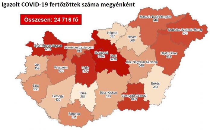 702 újabb magyar állampolgárnál mutatták ki az új koronavírus-fertőzést (COVID-19), ezzel 24 716 főre nőtt a hazánkban beazonosított fertőzöttek száma. Elhunyt 13 beteg, így az elhunytak száma 749 főre emelkedett, 5152-en pedig már meggyógyultak. Az aktív fertőzöttek száma 18 815 fő. Az aktív fertőzöttek 37%-a, az elhunytak 54%-a, a gyógyultak 39%-a budapesti. 693 koronavírusos beteget ápolnak kórházban, közülük 44-en vannak lélegeztetőgépen.