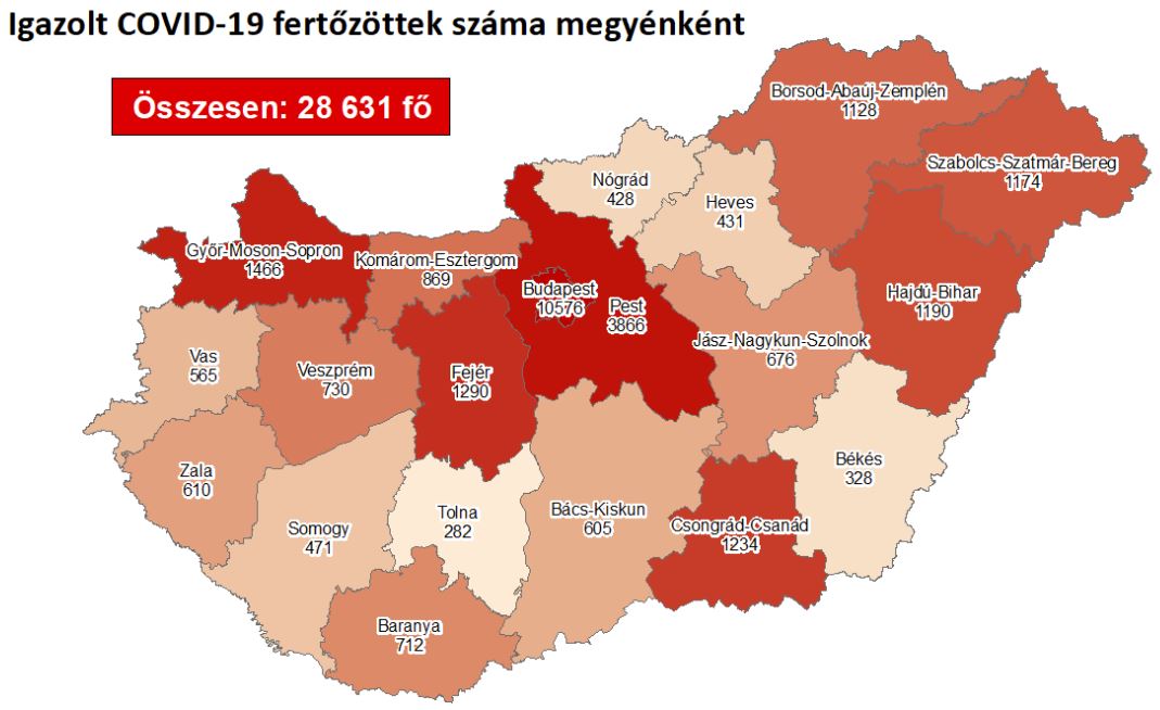 1322 újabb magyar állampolgárnál mutatták ki az új koronavírus-fertőzést (COVID-19), ezzel 28 631 főre nőtt a hazánkban beazonosított fertőzöttek száma. Elhunyt 17 beteg, így az elhunytak száma 798 főre emelkedett, 6349-en pedig már meggyógyultak. Az aktív fertőzöttek száma 21 484 fő. Az aktív fertőzöttek 36 %-a, az elhunytak 52 %-a, a gyógyultak 37%-a budapesti. 740 koronavírusos beteget ápolnak kórházban, közülük 47-en vannak lélegeztetőgépen.