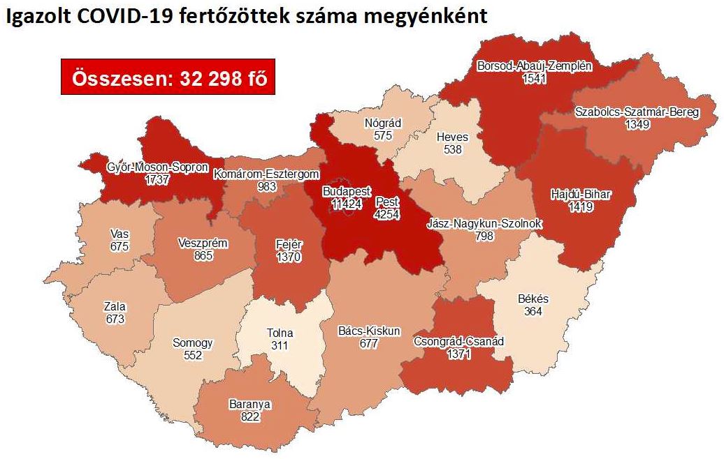818 újabb magyar állampolgárnál mutatták ki az új koronavírus-fertőzést (COVID-19), ezzel 32 298 főre nőtt a hazánkban beazonosított fertőzöttek száma. Elhunyt 20 beteg, így az elhunytak száma 853 főre emelkedett, 8 723-an pedig már meggyógyultak. Az aktív fertőzöttek száma 22 722 fő. Az aktív fertőzöttek 35%-a, az elhunytak 50%-a, a gyógyultak 34%-a budapesti. 627 koronavírusos beteget ápolnak kórházban, közülük 37-en vannak lélegeztetőgépen.