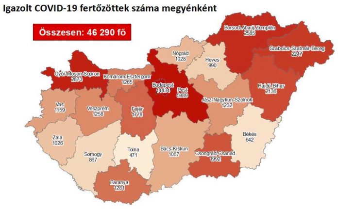 1474 újabb magyar állampolgárnál mutatták ki az új koronavírus-fertőzést (COVID-19), ezzel 46 290 főre nőtt a hazánkban beazonosított fertőzöttek száma. Elhunyt 33 idős, krónikus beteg, így az elhunytak száma 1142 főre emelkedett, 14 088-an pedig már meggyógyultak. Az aktív fertőzöttek száma 31 060 fő. Az aktív fertőzöttek 31%-a, az elhunytak 41%-a, a gyógyultak 30%-a budapesti. 1712 koronavírusos beteget ápolnak kórházban, közülük 179-en vannak lélegeztetőgépen.