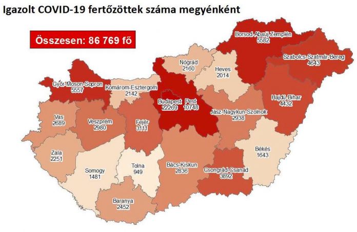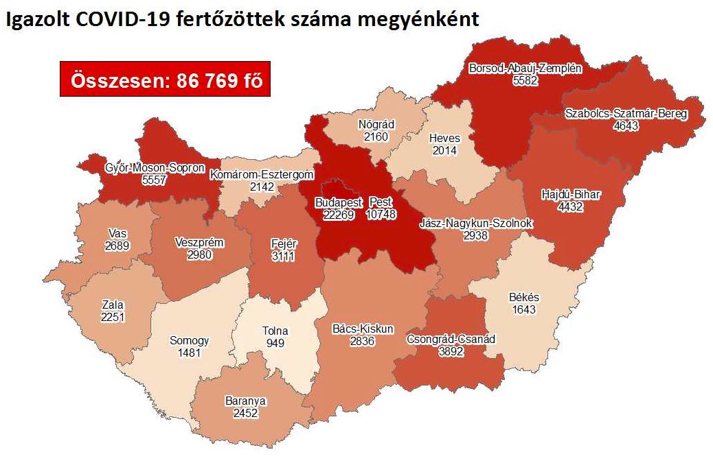 3989 újabb magyar állampolgárnál mutatták ki az új koronavírus-fertőzést (COVID-19), ezzel 86 769 főre nőtt a hazánkban beazonosított fertőzöttek száma. Elhunyt 84 többségében idős, krónikus beteg, így az elhunytak száma 1973 főre emelkedett, 20 856-an pedig már meggyógyultak. Az aktív fertőzöttek száma 63 940 fő. Az aktív fertőzöttek 25%-a, az elhunytak 32 %-a, a gyógyultak 28%-a budapesti. 4767 koronavírusos beteget ápolnak kórházban, közülük 348-an vannak lélegeztetőgépen.