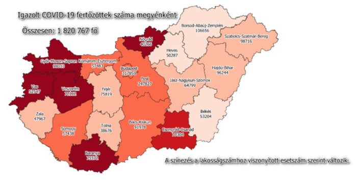 A beoltottak száma 6 399 532 fő, közülük 6 180 867 fő a második, 3 830 431 fő a harmadik, 236 755 fő már a negyedik oltását is felvette. 1503 új fertőzöttet igazoltak, ezzel a járvány kezdete óta összesen 1 820 767 főre nőtt a beazonosított fertőzöttek száma. Elhunyt 64 többségében idős, krónikus beteg, így az elhunytak száma 44 895 főre emelkedett. A gyógyultak száma folyamatosan nő, jelenleg 1 667 111 fő, az aktív fertőzöttek száma pedig 108 761 főre csökkent. 2287 koronavírusos beteget ápolnak kórházban, közülük 90-en vannak lélegeztetőgépen. A járvány ötödik hullámának leszálló ágában vagyunk, ezért kormány kivezette a járványügyi korlátozásokat és megszűnt a maszkviselési kötelezettség. Ma délután, pénteken és szombaton is lesz oltási akciónap.