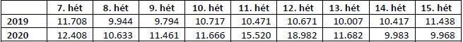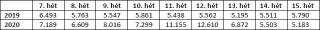 - 2020-ban nagypéntek a 15. hét péntekjére esett, így a 15. héten 1 munkanappal kevesebb volt.