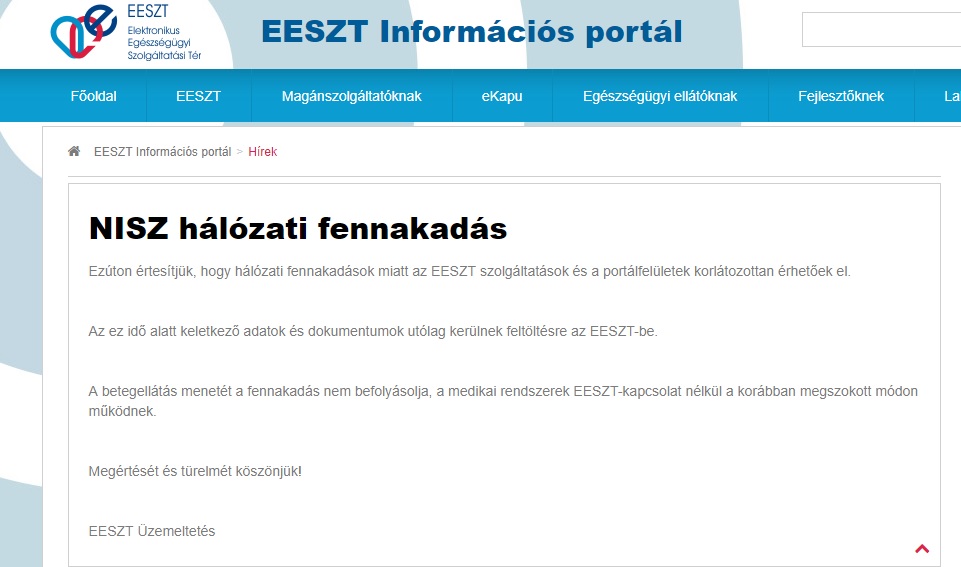 2018.09.19 délután 13:30-tól folyamatosan akadozik az EESZT, illetve a bejelentkezés. Még 19 órakor is többen jelezték a problémát.
